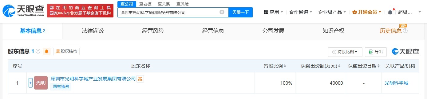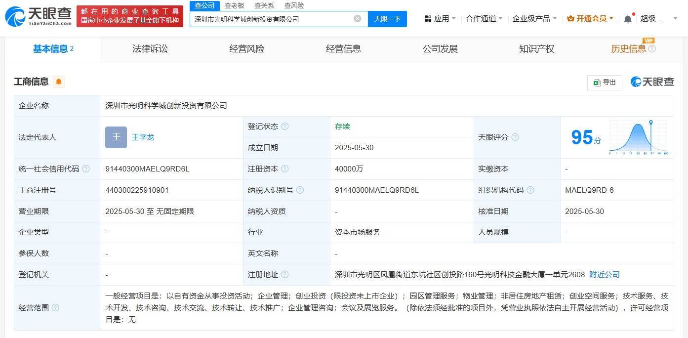 天眼查App显示,近日股票知识网,深圳市光明科学城创新投资有限公司成立,法定代表人为王学龙,注册资本4亿人民币,经营范围包括以自有资金从事投资活动、企业管理、创业投资等,由深圳市光明科学城产业发展集团有限公司全资持股。
